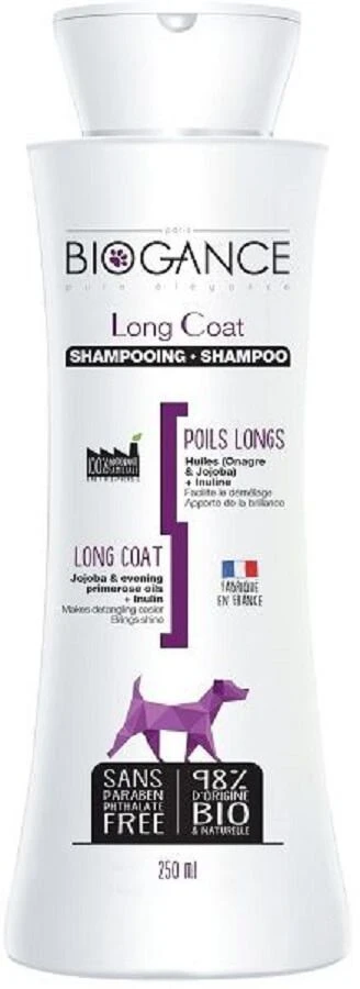 Votre animal a de longs poils et même s’ils sont très beaux, un tel pelage nécessite du travail, ce shampoing Biogance vous permettra de prendre soin de lui et de son sublime pelage. Il est formulé à base de Jojoba, d’Evening Primrose et D’inuline pour nourrir le poil. Grâce à ces ingrédients le produit va nourrir le poil, apporter de la douceur, de l’éclat et de la brillance au pelage mais aussi faciliter le démêlage. Le shampoing est sans paraben, au pH neutre, composé à 98% d’ingrédients d’origine naturelle et Bio.